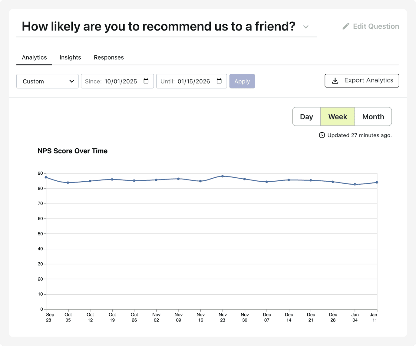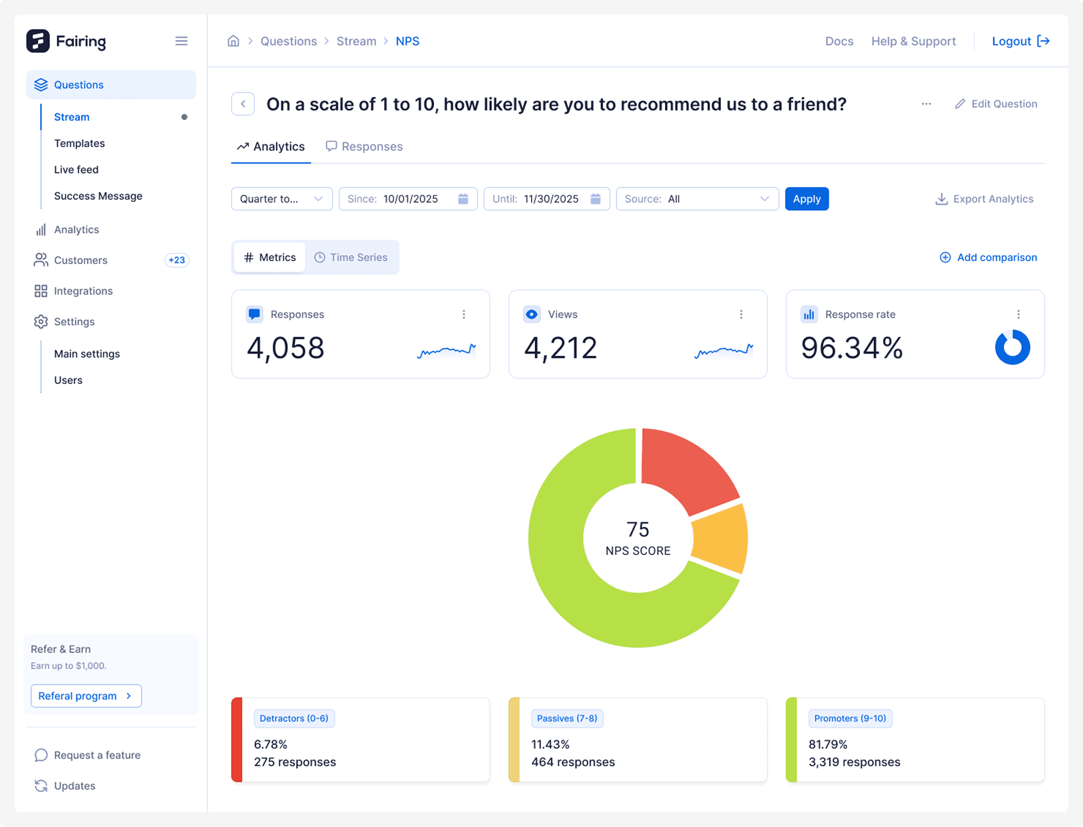 Fairing automatically calculates your NPS score, buckets responses so you can act on them, and tracks your score over time. Trigger different follow-ups based on score, route detractors to support, and ask promoters for reviews.