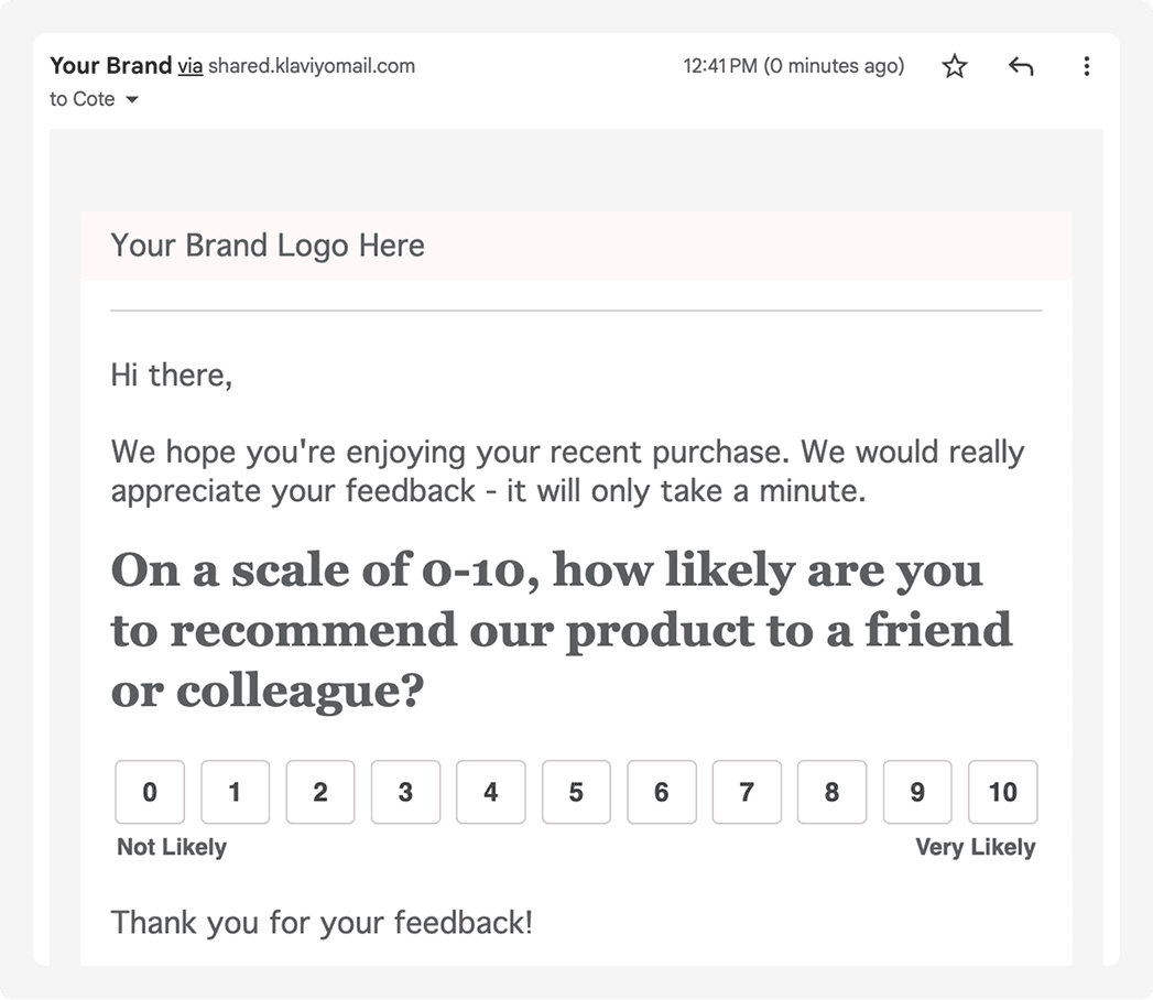 Customers select their score directly in the email, then land on a branded page to answer "What's the main reason for your score?" You get the number and the context behind it.